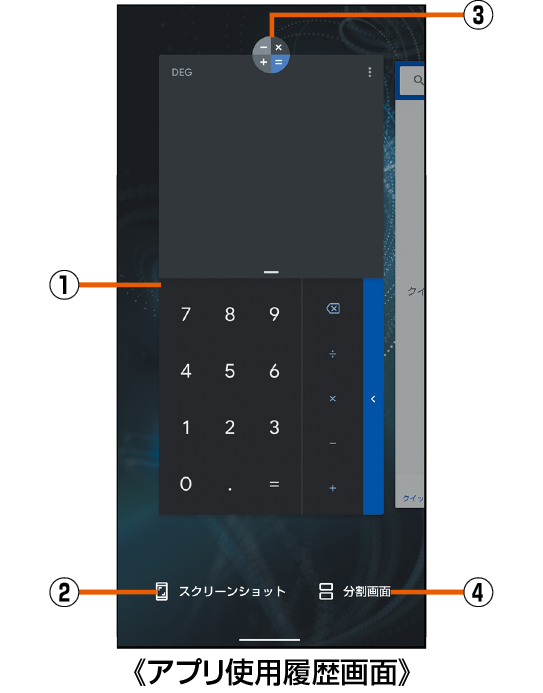アプリ使用履歴画面中央に、分割画面上部で利用するアプリを表示→[分割画面]