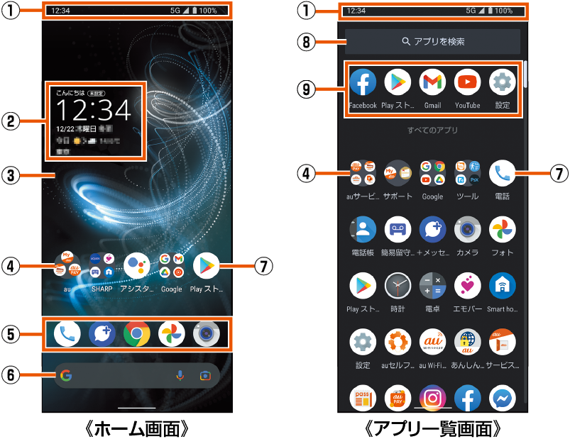 AQUOS Homeは、ホーム画面(デスクトップシート/お気に入りトレイ)とアプリ一覧画面で構成されたホームアプリです。