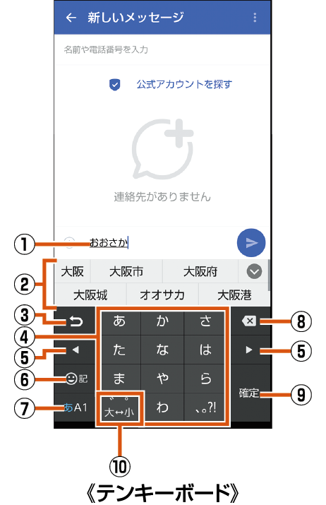 一般的な携帯電話と同じ順序で文字が並んでいるキーボードです。文字入力キーを繰り返しタップして文字を切り替え、文字を入力します。 |