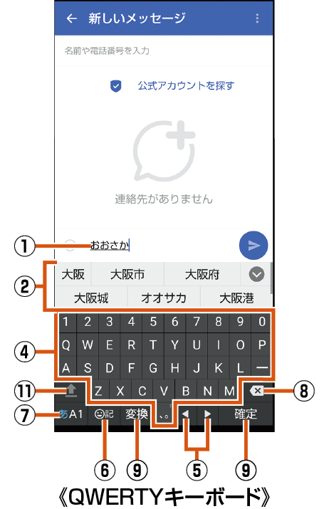 一般的なパソコンと同じ順序で文字が並んでいるキーボードです。文字入力キーをタップして、表示されている文字を入力します。 |