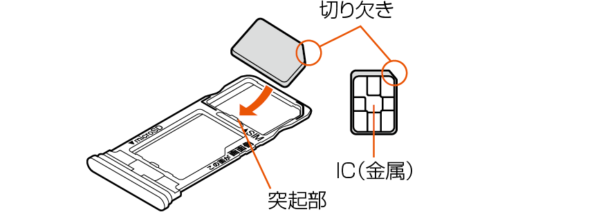au ICカードのIC(金属)面を下向きにして、au ICカード/microSDメモリカードトレイの突起部に押し当てながら取り付ける