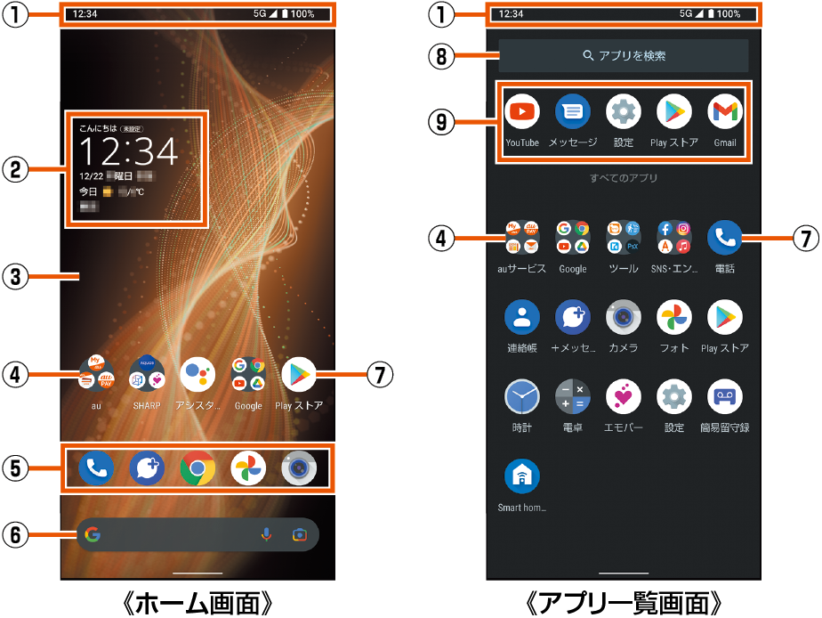 AQUOS Homeは、ホーム画面(デスクトップシート/お気に入りトレイ)とアプリ一覧画面で構成されたホームアプリです。