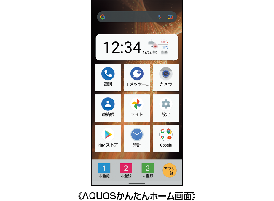 AQUOSかんたんホームは、ホーム画面(デスクトップシート)とアプリ一覧画面で構成されたホームアプリです。