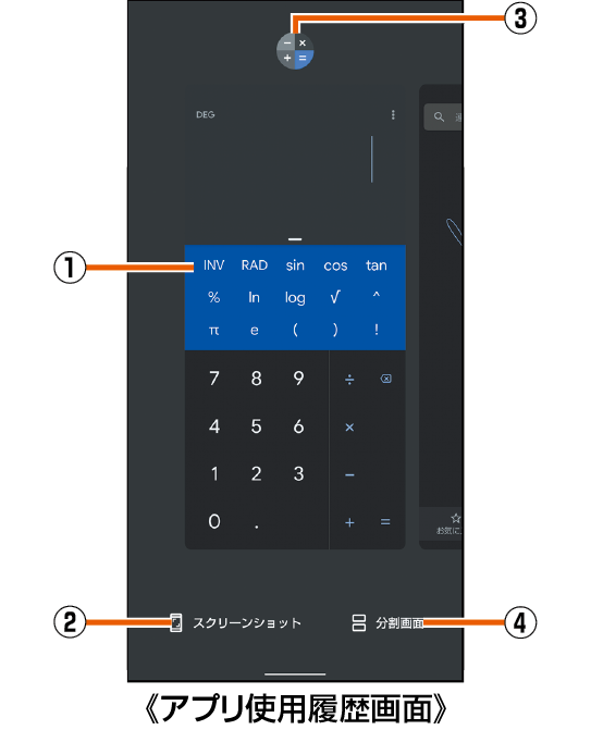 アプリ使用履歴画面中央に、分割画面上部で利用するアプリを表示→[分割画面]