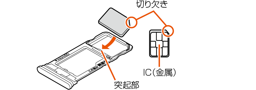 au ICカードのIC(金属)面を下向きにして、au ICカード/microSDメモリカードトレイの突起部に押し当てながら取り付ける