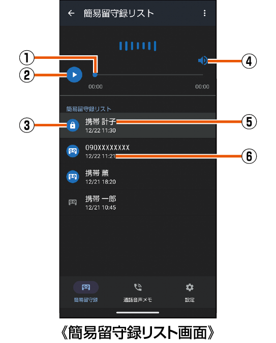 簡易留守録/通話音声メモの再生や、簡易留守録の設定を行います。 録音した簡易留守録/通話音声メモの再生について詳しくは、「簡易留守録/通話音声メモを再生する」をご参照ください。 簡易留守録の設定について詳しくは、「簡易留守録を利用する」をご参照ください。 |