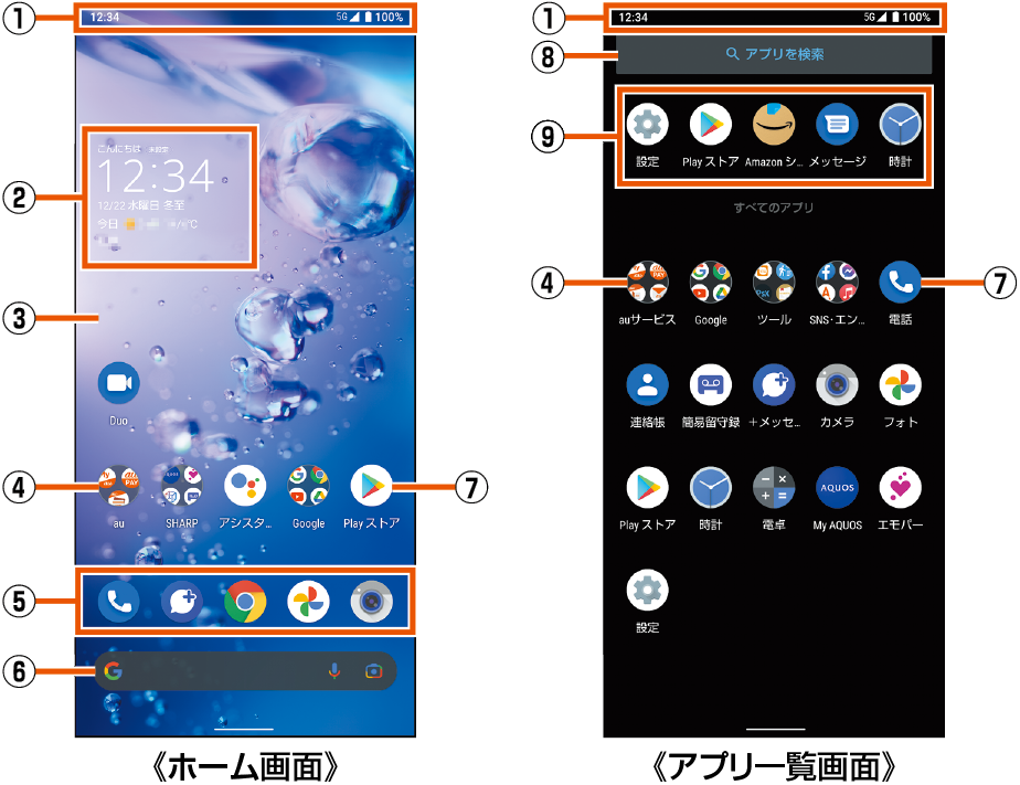 AQUOS Homeは、ホーム画面(デスクトップシート/お気に入りトレイ)とアプリ一覧画面で構成されたホームアプリです。