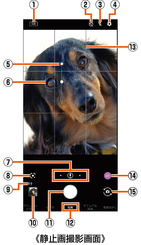 カメラ切替について 撮影モードや撮影サイズによっては、使用できるカメラやズーム倍率、機能が制限されます。 |