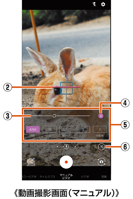 画面下部を左右にスライドして撮影モードを「ビデオ」/「マニュアルビデオ」に切り替える