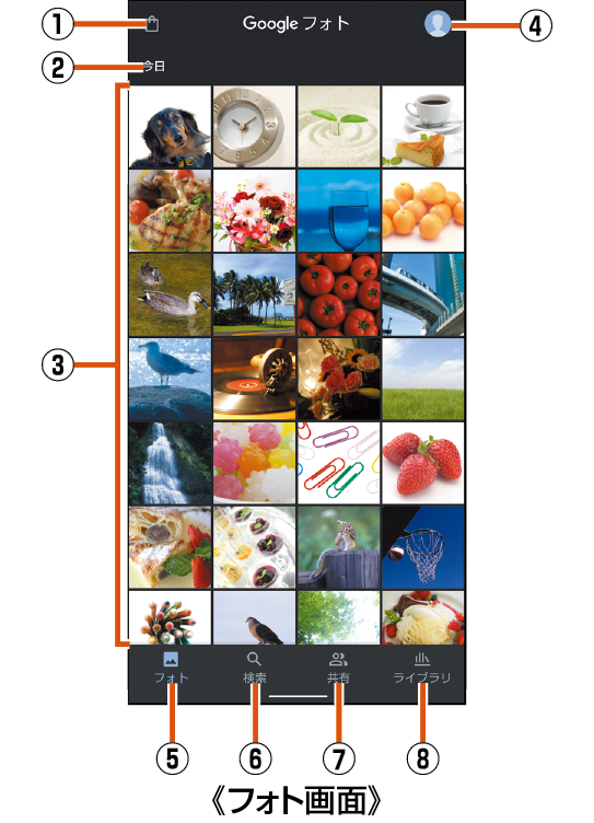 「フォト」アプリはPlay ストアより更新することができ、最新バージョンでは操作方法が変わることがあります。更新された場合は、フォト画面でアカウント設定のアイコンをタップ→[ヘルプとフィードバック]と操作し、内容をご確認ください。 |