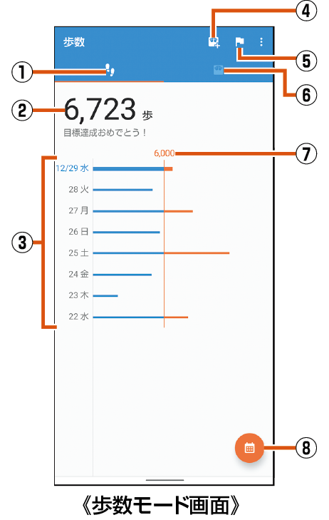 日々/月々の歩数が棒グラフで表示されます。グラフをタップすると、選択した日/月の歩数や歩行距離、消費カロリーなど、詳細情報が表示されます。