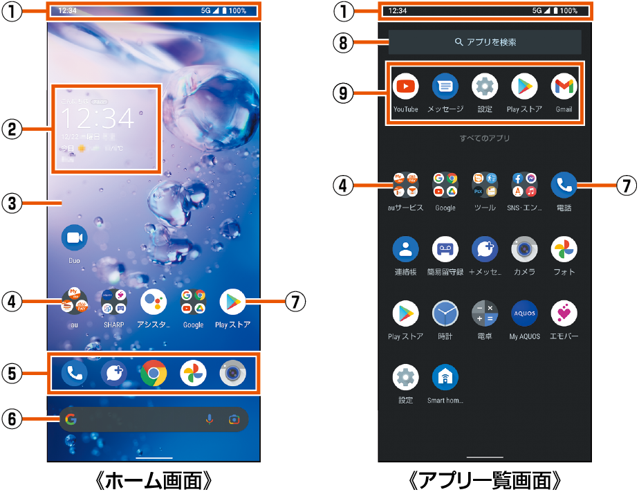 AQUOS Homeは、ホーム画面(デスクトップシート/お気に入りトレイ)とアプリ一覧画面で構成されたホームアプリです。