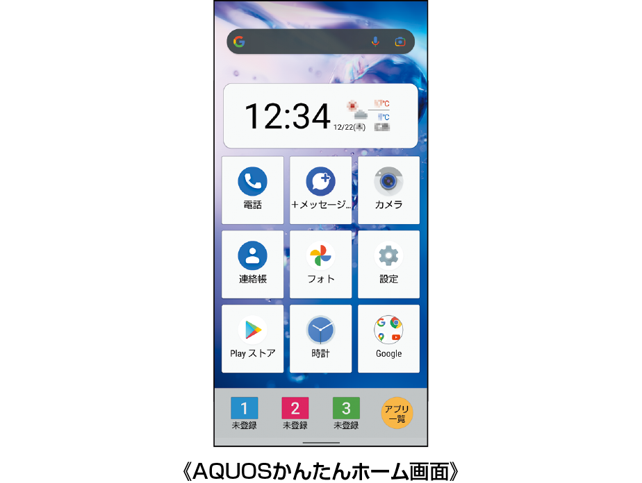 AQUOSかんたんホームは、ホーム画面(デスクトップシート)とアプリ一覧画面で構成されたホームアプリです。