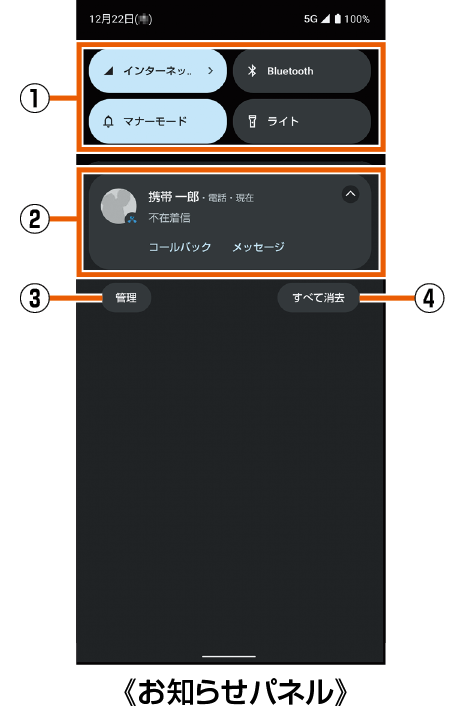 お知らせ/ステータスパネルでは、お知らせアイコンとステータスアイコンの確認や対応するアプリケーションの起動ができます。