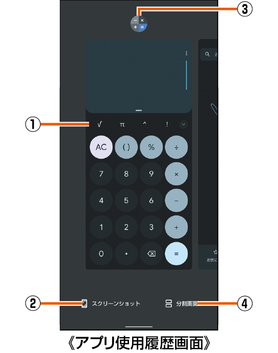 アプリ使用履歴画面中央に、分割画面上部で利用するアプリを表示→[分割画面]