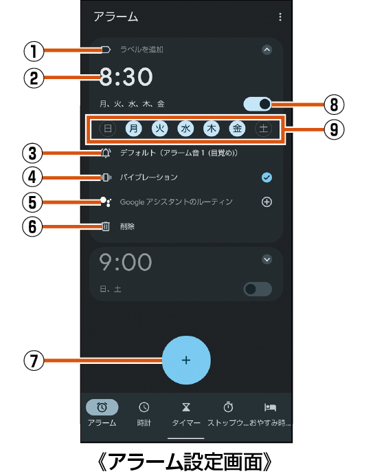 ホーム画面→「アプリ一覧画面」を表示→[時計]→[アラーム]
