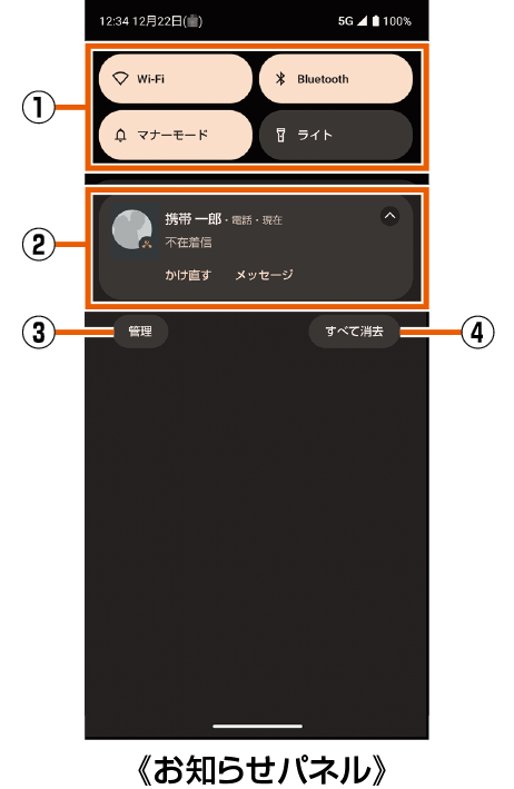 画面を上下にスライドすると、お知らせパネル/ステータスパネルを切り替えられます。 |