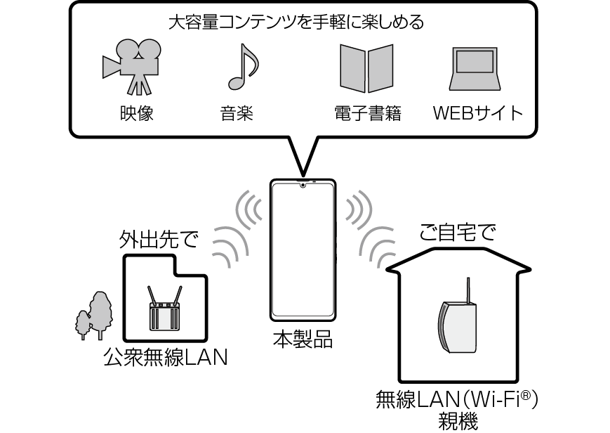 家庭内で構築した無線LAN(Wi-Fi®)環境や、外出先の公衆無線LAN環境を利用して、インターネットサービスに接続できます。
