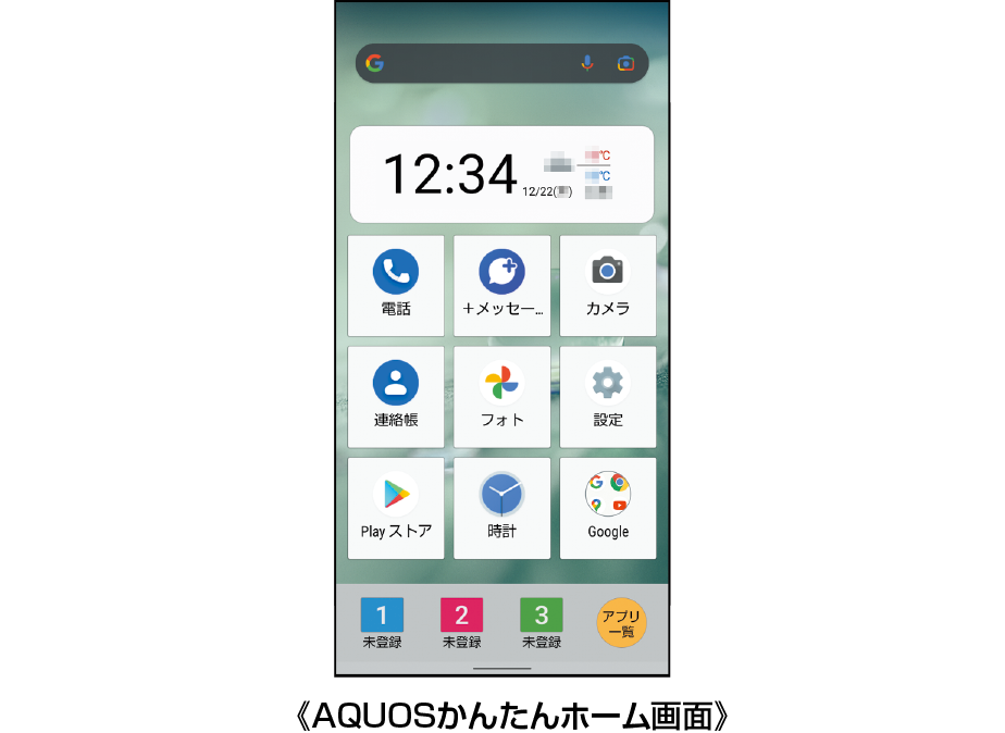 AQUOSかんたんホームは、ホーム画面(デスクトップシート)とアプリ一覧画面で構成されたホームアプリです。