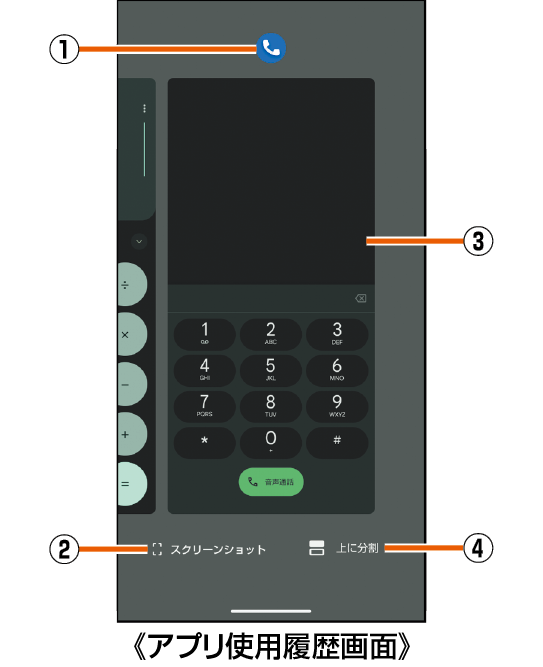 アプリ使用履歴画面中央に、分割画面上部で利用するアプリを表示→[上に分割]