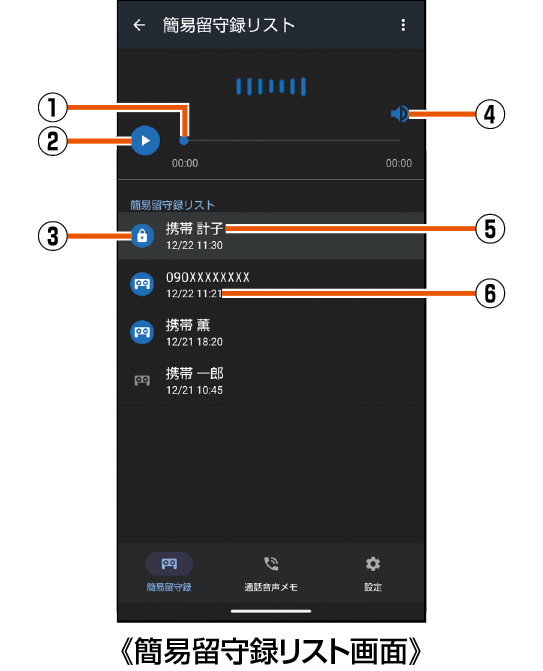 簡易留守録リスト画面/通話音声メモリスト画面が表示されます。