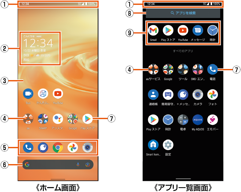 AQUOS Homeは、ホーム画面(デスクトップシート/お気に入りトレイ)とアプリ一覧画面で構成されたホームアプリです。
