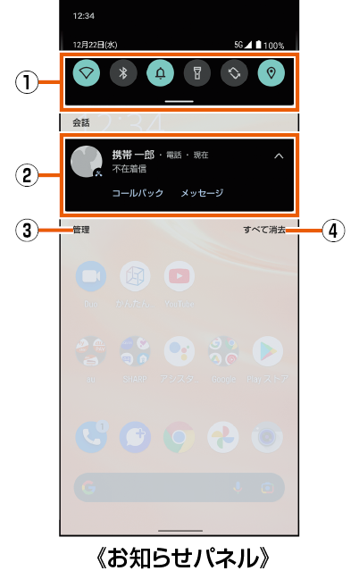 お知らせ/ステータスパネルでは、お知らせアイコンとステータスアイコンの確認や対応するアプリケーションの起動ができます。