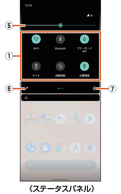 画面を上下にスライドすると、お知らせパネル/ステータスパネルを切り替えられます。 |
