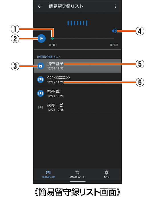 簡易留守録リスト画面/通話音声メモリスト画面が表示されます。
