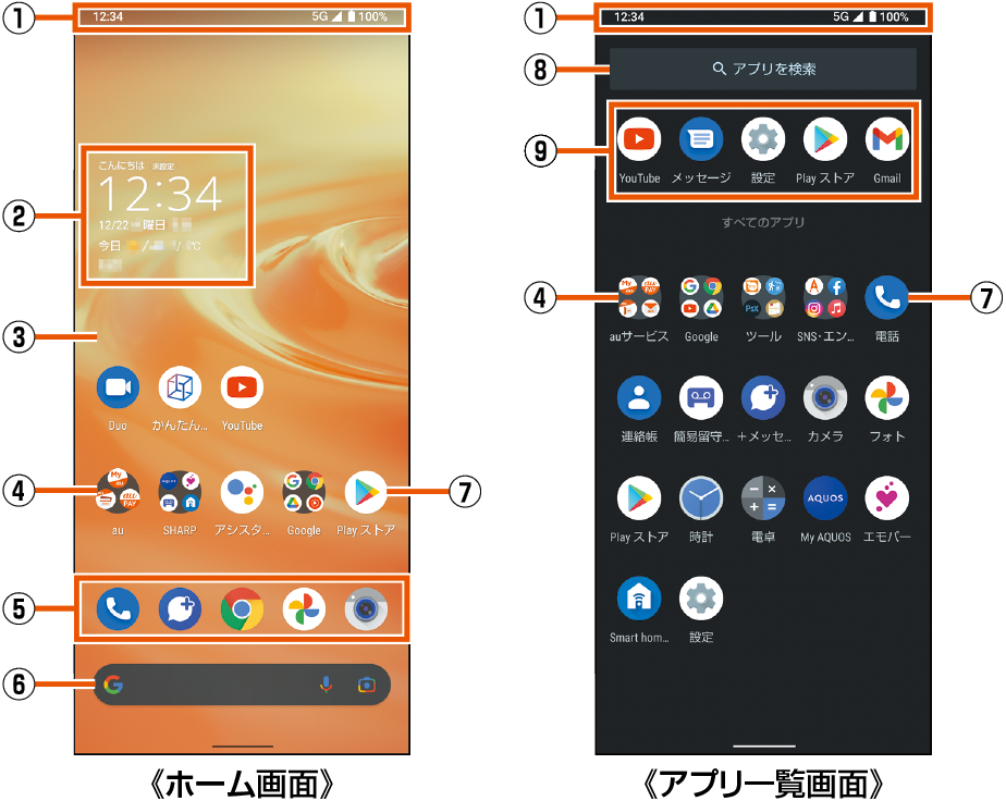 AQUOS Homeは、ホーム画面(デスクトップシート/お気に入りトレイ)とアプリ一覧画面で構成されたホームアプリです。