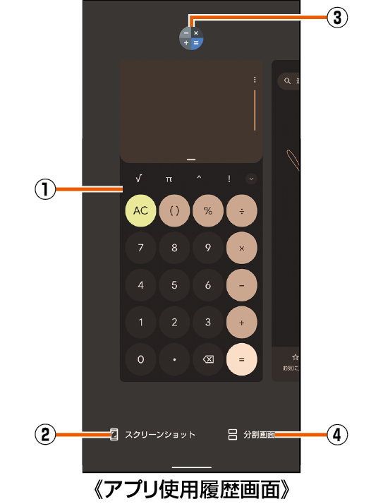 アプリ使用履歴画面中央に、分割画面上部で利用するアプリを表示→[分割画面]