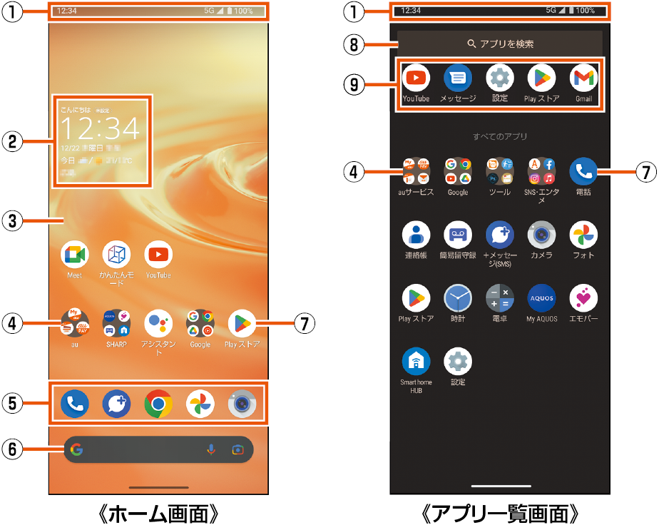 AQUOS Homeは、ホーム画面(デスクトップシート/お気に入りトレイ)とアプリ一覧画面で構成されたホームアプリです。