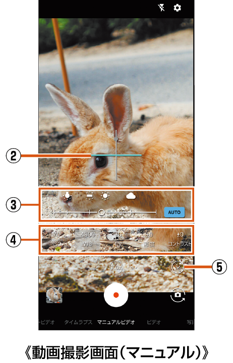 シャッター速度やISO感度、ホワイトバランスなどの設定値が表示されます。項目をタップすると調整バーが表示され、マニュアル設定・補正を行うことができます。