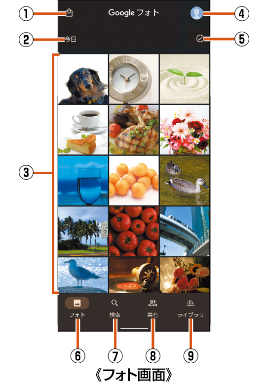 「フォト」アプリはGoogle Playより更新することができ、最新バージョンでは操作方法が変わることがあります。更新された場合は、フォト画面でアカウント設定のアイコンをタップ→[ヘルプとフィードバック]と操作し、内容をご確認ください。 |