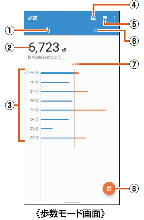 日々/月々の歩数が棒グラフで表示されます。グラフをタップすると、選択した日/月の歩数や歩行距離、消費カロリーなど、詳細情報が表示されます。