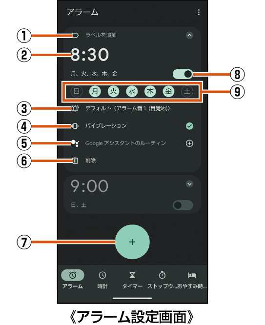 ホーム画面→「アプリ一覧画面」を表示→[時計]→[アラーム]