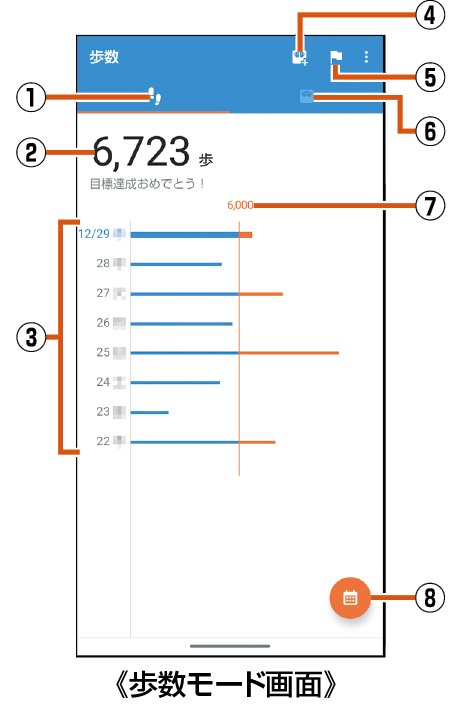 日々/月々の歩数が棒グラフで表示されます。グラフをタップすると、選択した日/月の歩数や歩行距離、消費カロリーなど、詳細情報が表示されます。