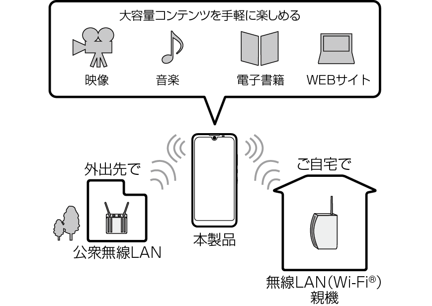 家庭内で構築した無線LAN(Wi-Fi®)環境や、外出先の公衆無線LAN環境を利用して、インターネットサービスに接続できます。
