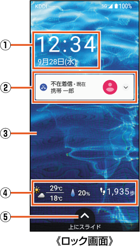 「画面ロック」で解除方法を設定している場合は、設定した方法で画面ロックを解除してください。解除方法を「なし」に設定している場合は、ロック画面は表示されません。 |