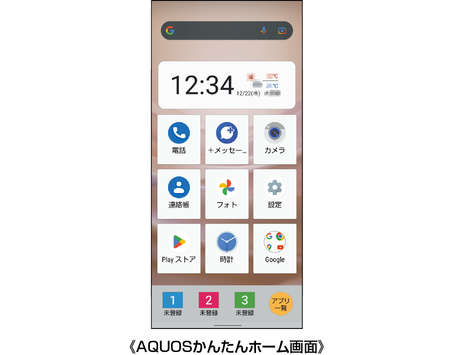 AQUOSかんたんホームは、ホーム画面(デスクトップシート)とアプリ一覧画面で構成されたホームアプリです。