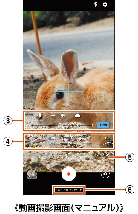 シャッター速度やISO感度、ホワイトバランスなどの設定値が表示されます。項目をタップすると調整バーが表示され、マニュアル設定・補正を行うことができます。