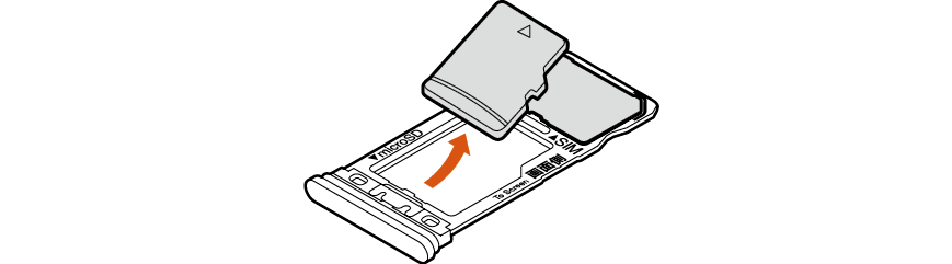 microSDメモリカードの端子(金属)面を下向きにして、SIMカード/microSDメモリカードトレイの突起部に押し当てながら取り付ける