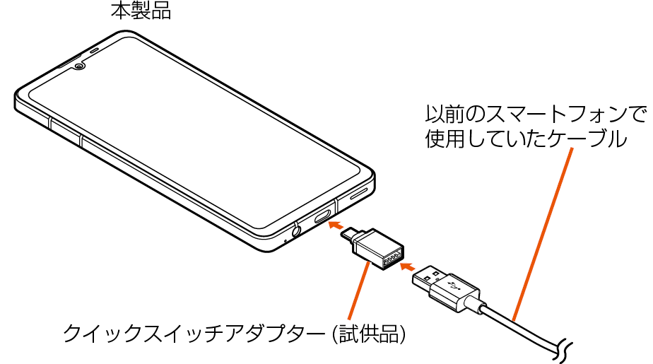 クイックスイッチアダプター(試供品)は、データの引き継ぎ以外の用途(充電など)には使用しないでください。 |