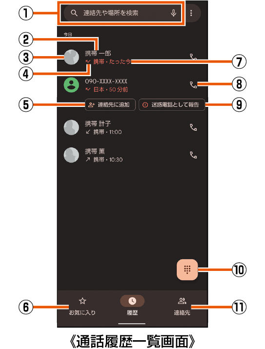 タップすると、連絡帳への登録やメッセージの送信、通話履歴の詳細の確認などを行うことができます。