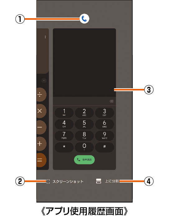 アプリ使用履歴画面中央に、分割画面上部で利用するアプリを表示→[上に分割]