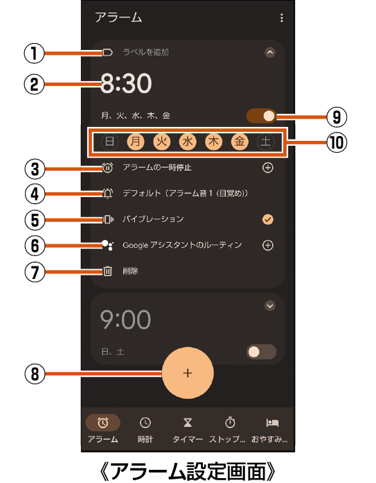 ホーム画面→「アプリ一覧画面」を表示→[時計]→[アラーム]