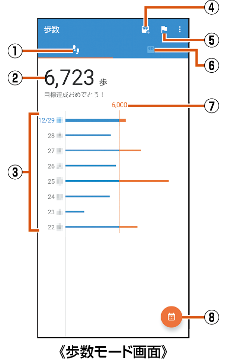 日々/月々の歩数が棒グラフで表示されます。グラフをタップすると、選択した日/月の歩数や歩行距離、消費カロリーなど、詳細情報が表示されます。