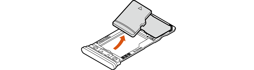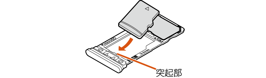 microSDメモリカードの端子(金属)面を下向きにして、SIMカード/microSDメモリカードトレイの突起部に押し当てながらはめ込む