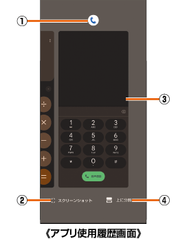 アプリ使用履歴画面中央に、分割画面上部で利用するアプリを表示→[上に分割]