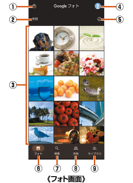 「フォト」アプリはGoogle Playより更新することができ、最新バージョンでは操作方法が変わることがあります。更新された場合は、フォト画面でアカウント設定のアイコンをタップ→[ヘルプとフィードバック]と操作し、内容をご確認ください。 |